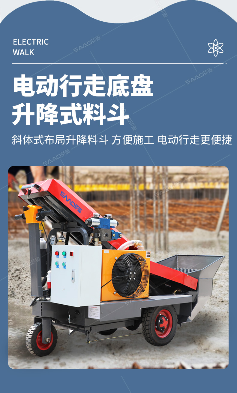 采用電動行走底盤,斜體式布局升降料斗,采用雙排風冷散熱系統(tǒng)散熱效果更好,液壓系統(tǒng)采用國內知名廠商葉片泵,故障率低,壽命更長,性能更穩(wěn)定,超長行程料缸大大提高了輸送