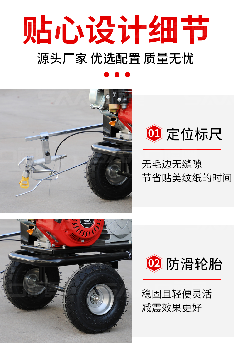冷噴劃線機是常溫標線施工的專用設備,噴出的線型清晰、流暢、飽滿、均勻,主要用于公路、停車場、機場、加油站、公司廠區(qū)等涂畫直線、虛線、曲線、斑馬線、文字、箭頭、圖形