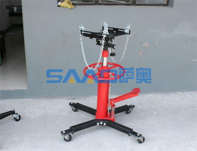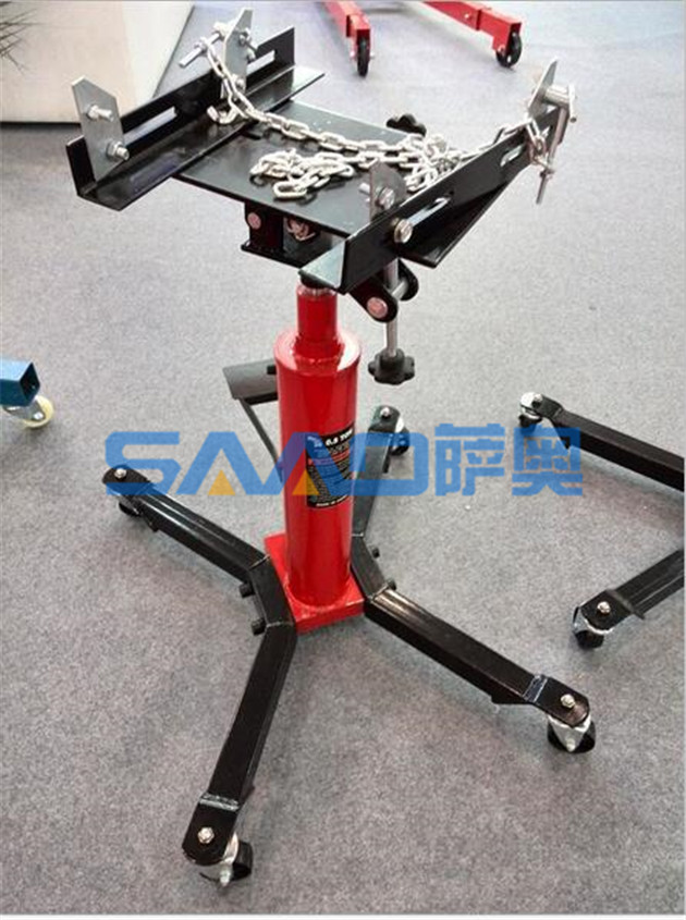 2、將液壓運(yùn)送舉升器推入汽車(chē)下面,并將液壓運(yùn)送舉升器升到合適位置,拆下需維修的物件(如:變速箱、發(fā)動(dòng)機(jī)、傳動(dòng)軸、前后橋等)放于托架中心,然后用鋼鏈系牢物件,打開(kāi)卸荷閥,將托架和物件放到底位。